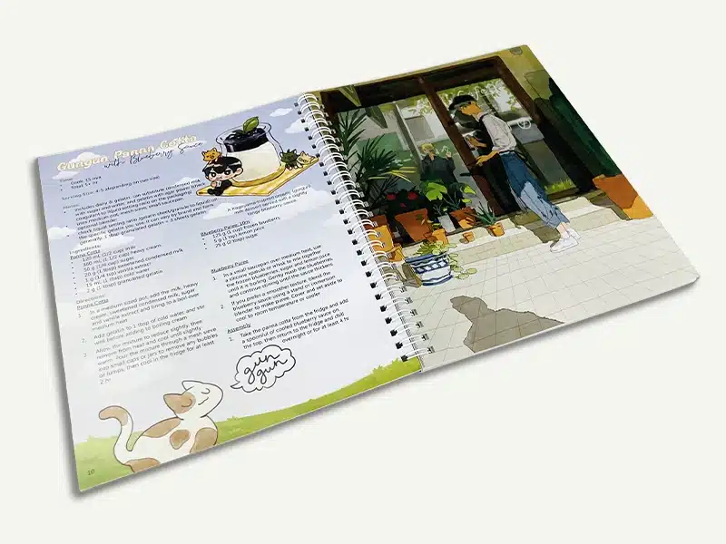| The most popular choice for manga. Interior pages are glued at the spine into a wraparound cover, similar to a standard paperback. Perfect for serialized stories, collections, or one-shots. | Interior pages are grouped into sewn signatures and cased into a hard cover. A great choice for collector’s editions or premium campaigns. | Folded sheets are nested and stapled through the spine. This style is cost-effective and suited for short works—ideal for zines or booklets up to 64 pages. |