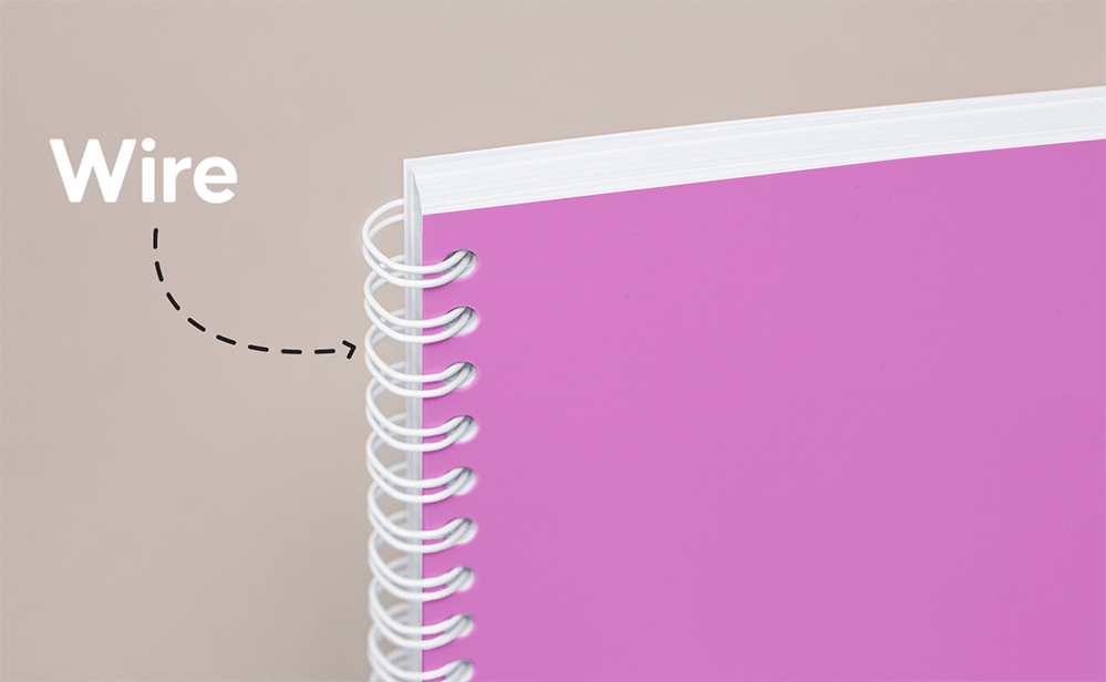 Holes are punched along the edge of a stack of pages, and a continuous spiral wire coil is threaded through to bind the pages together creating a flexible, durable spine that allows the book to lay flat when open. It's often used for calendars and manuals.