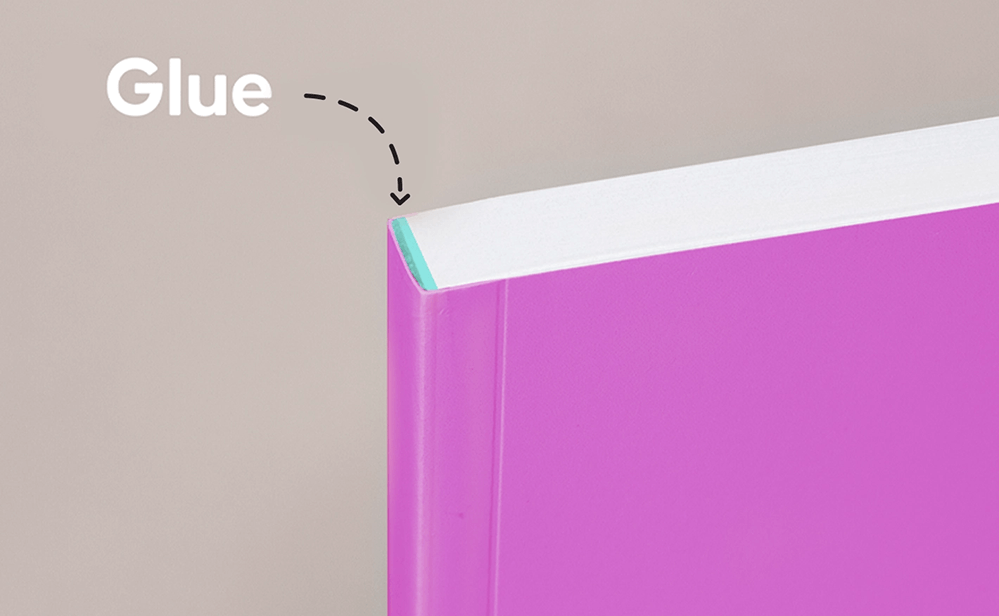 Individual pages are stacked together and glued along the spine with a strong flexible adhesive. Pages are trimmed to create a clean edge, and the cover is attached to the spine with glue. Commonly used for paperback books and professional brochures.