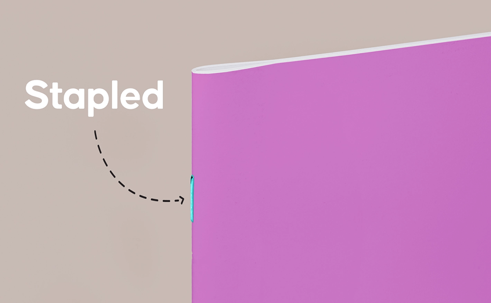 Sometimes called stapled binding, folded sheets of paper are stacked together and then stapled along the crease of the fold. Commonly used for booklets, magazines, and pamphlets with a small number of pages.